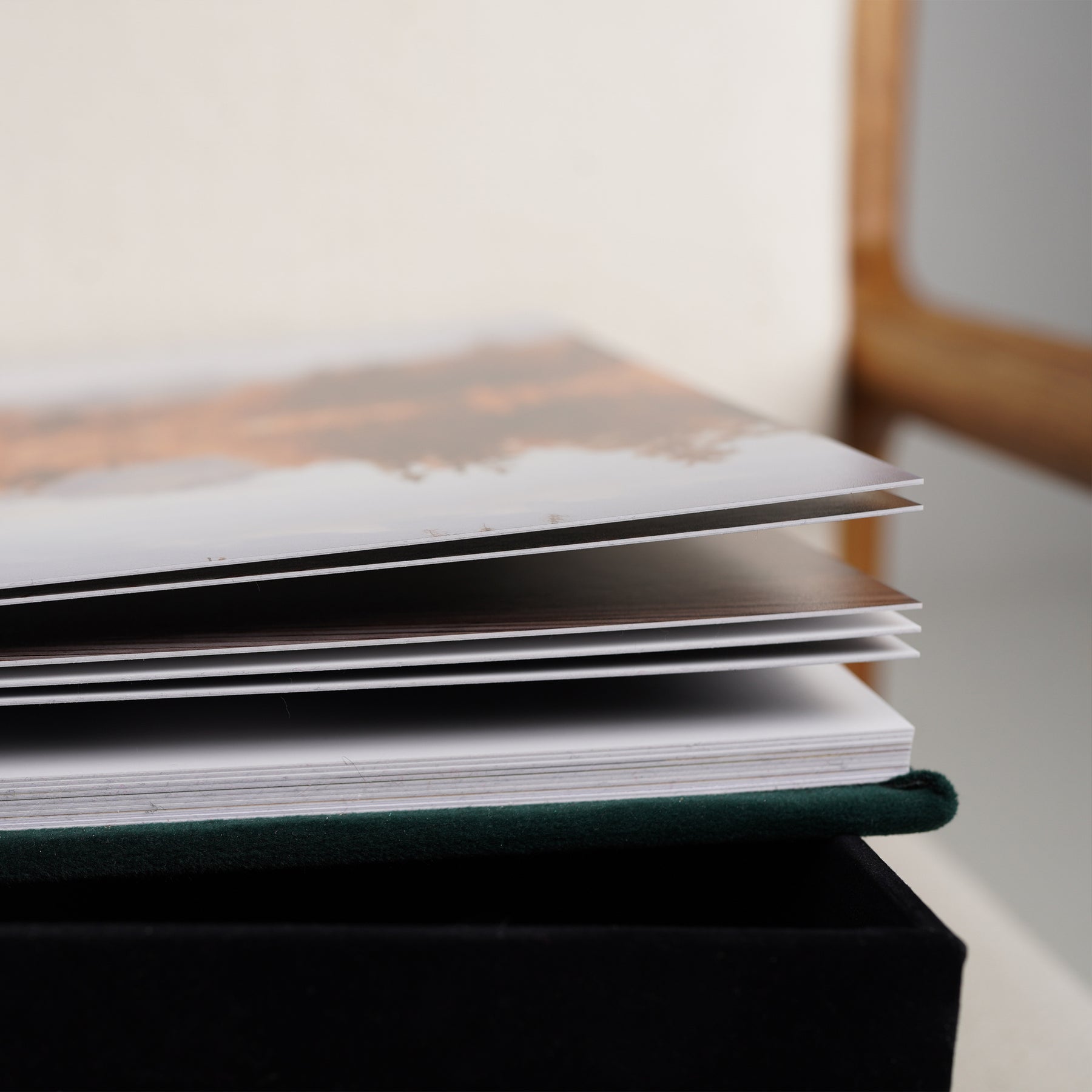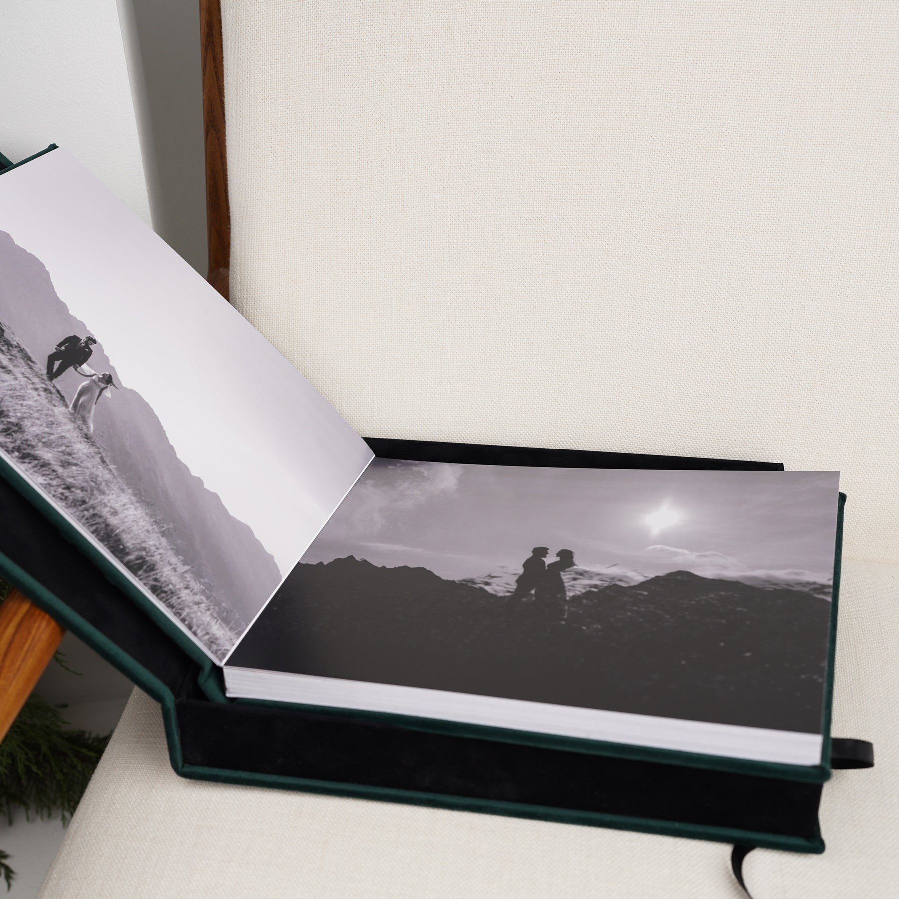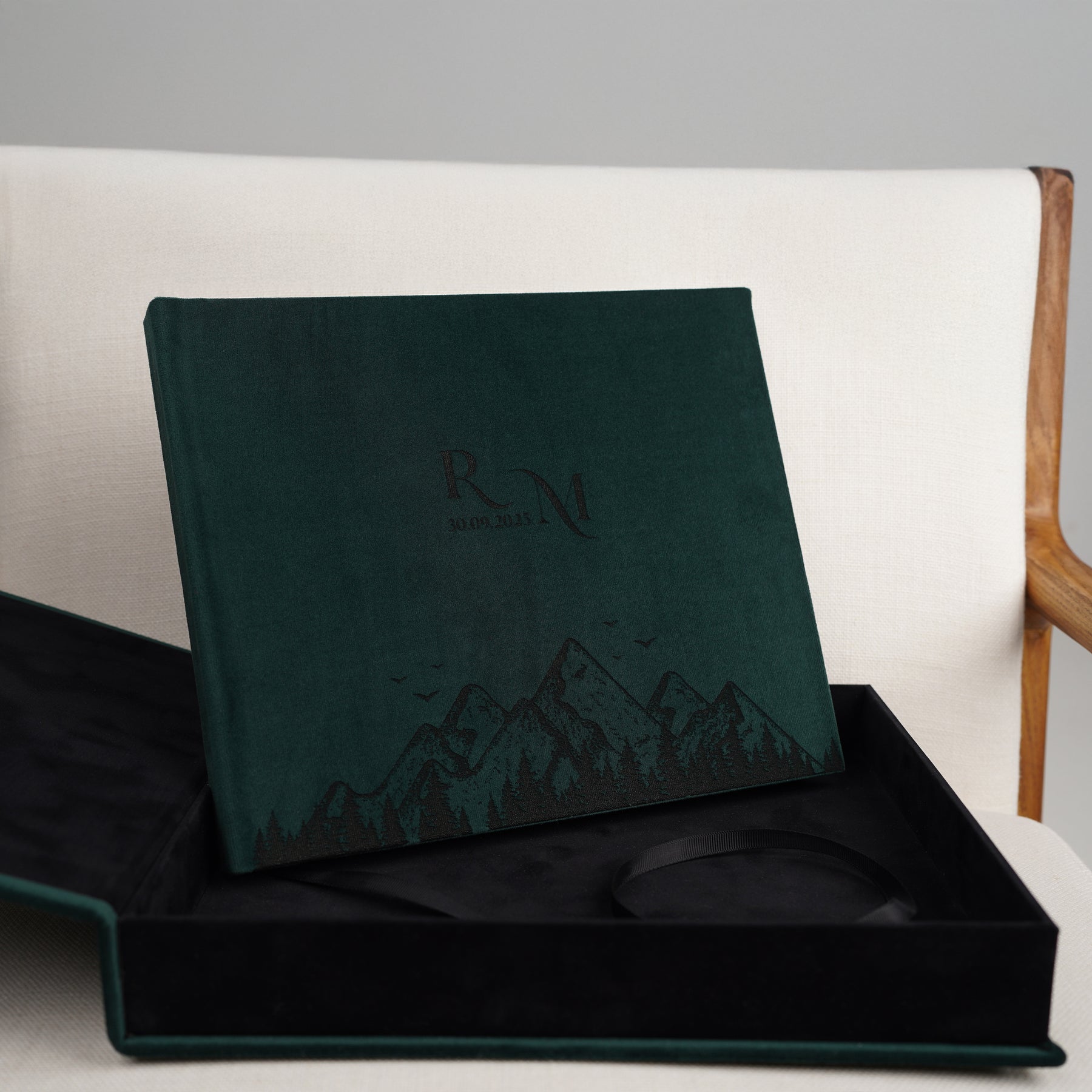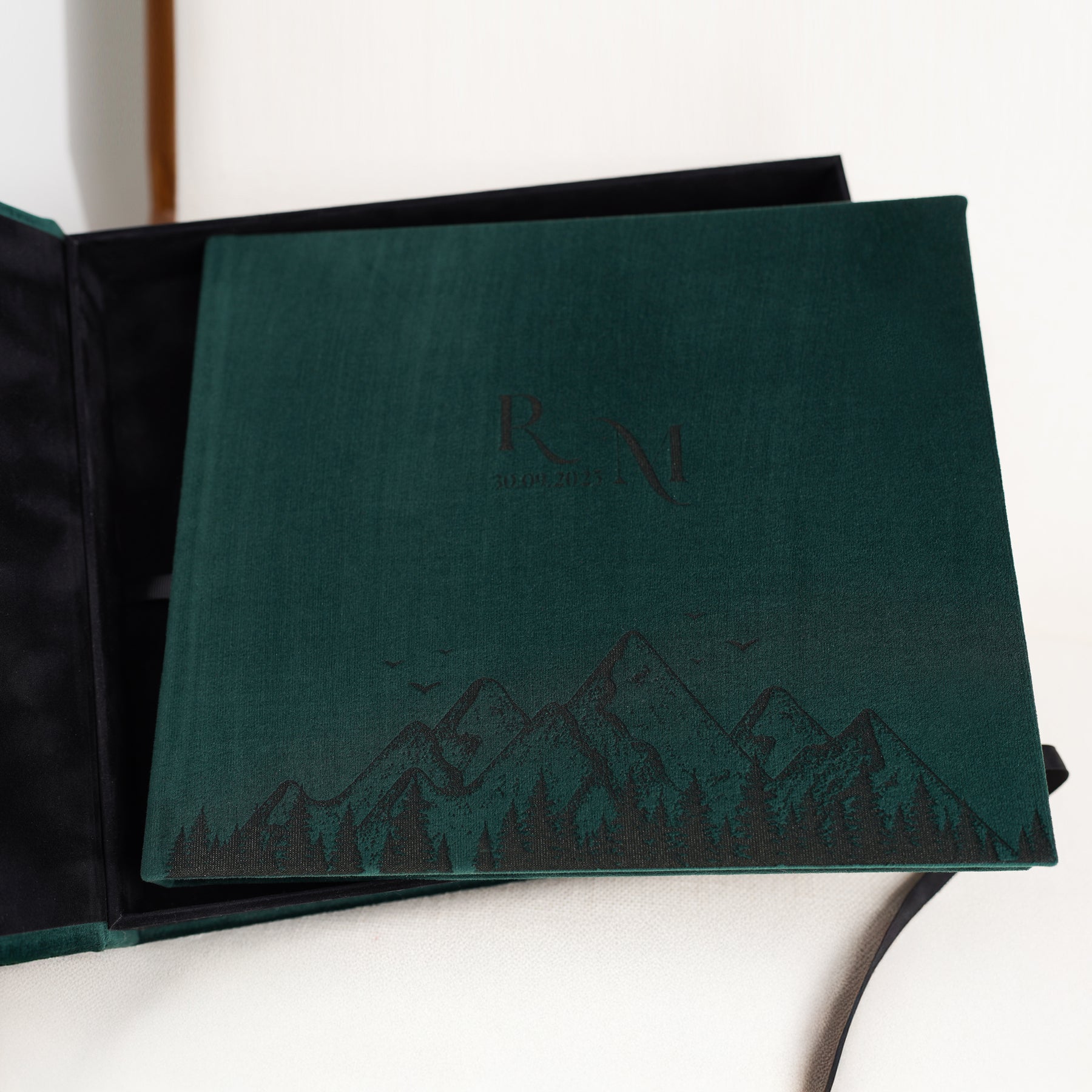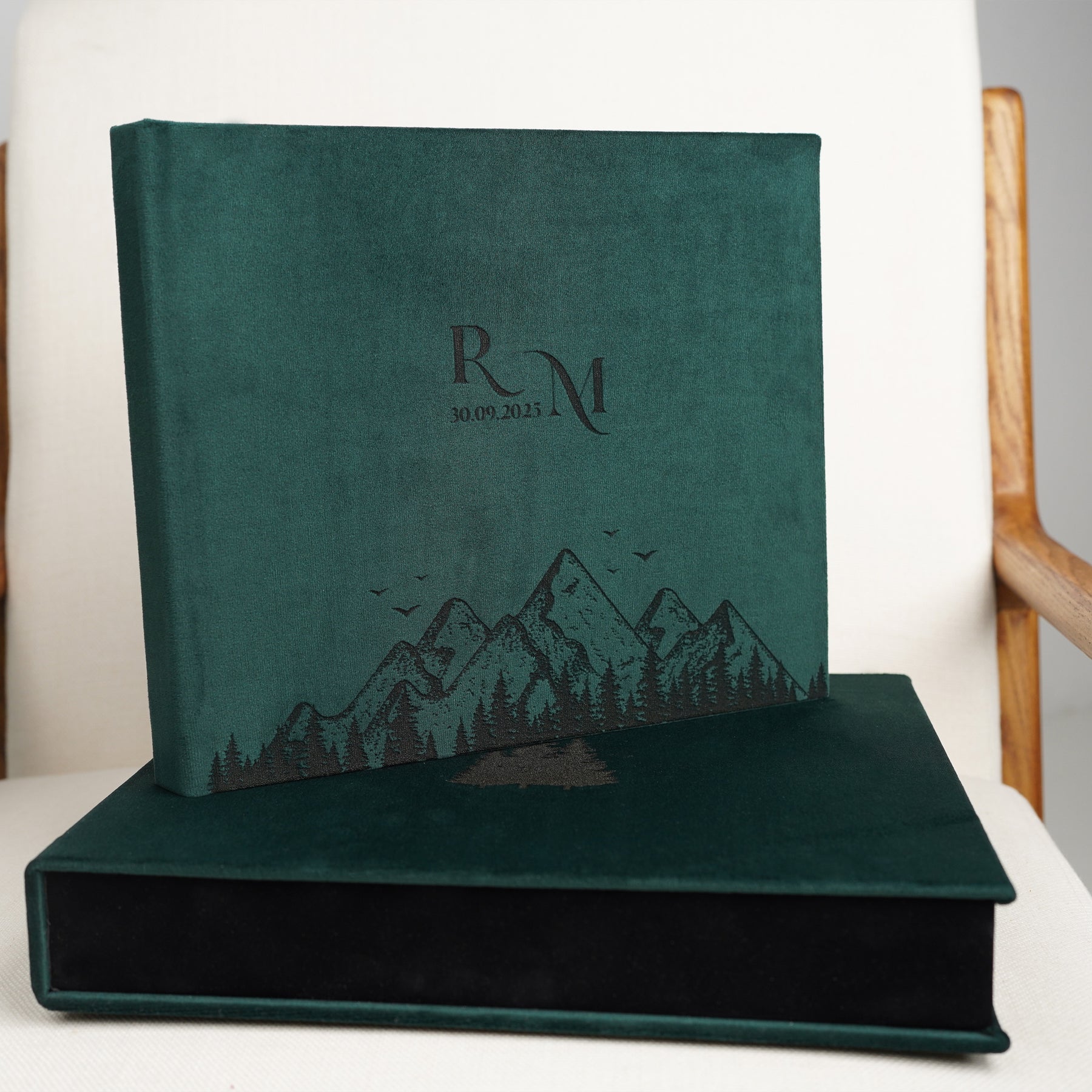 Realizat manual din catifea premium verde închis, cu gravură fină ce ilustrează siluetele munților și ale brazilor, acest album este alegerea perfectă pentru cuplurile care iubesc aventura, aerul liber și emoțiile autentice.